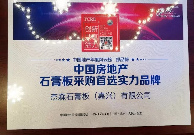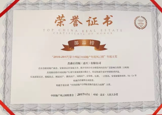 2017年,1月11日,由全聯房地產商會、安家雜志社主辦的“2016-2017(第十四屆)中國地產年度風云榜”在北京人民大會堂圓滿落幕。這場一年一度的中國地產年度風云榜,成為年底萬千地產人熱捧的年度盛宴。杰森有幸出現在此屆風云榜榜單中,榮獲“中國房地產石膏板采購首選實力品牌”。這是對杰森的肯定,亦是對杰森的鼓勵。