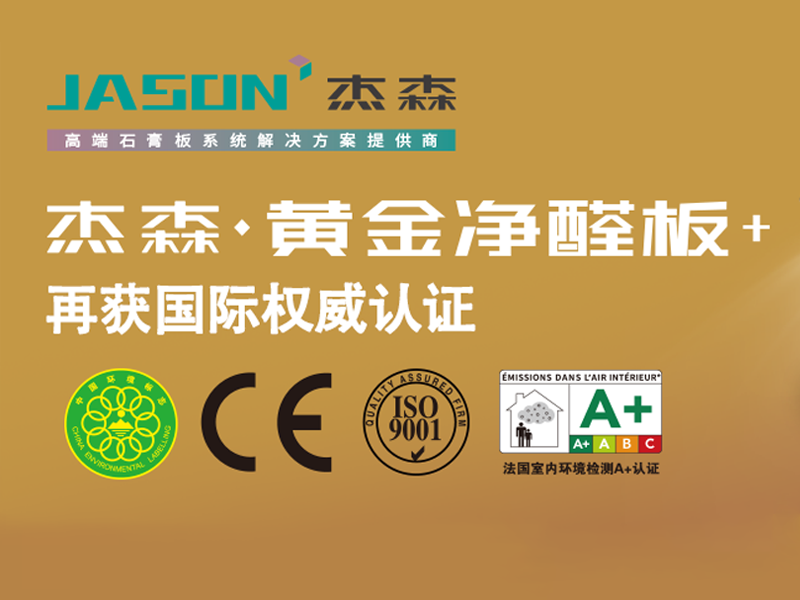杰森旗下高端家裝石膏板產品——杰森黃金凈醛板+通過了在國際上享有極高聲譽的法國室內空氣環境檢測A+認證,這是該產品繼歐盟CE認證之后,取得的又一項國際權威認證,標志著杰森黃金凈醛板+在綠色環保安全品質方面,再次獲得國際權威機構的認可。