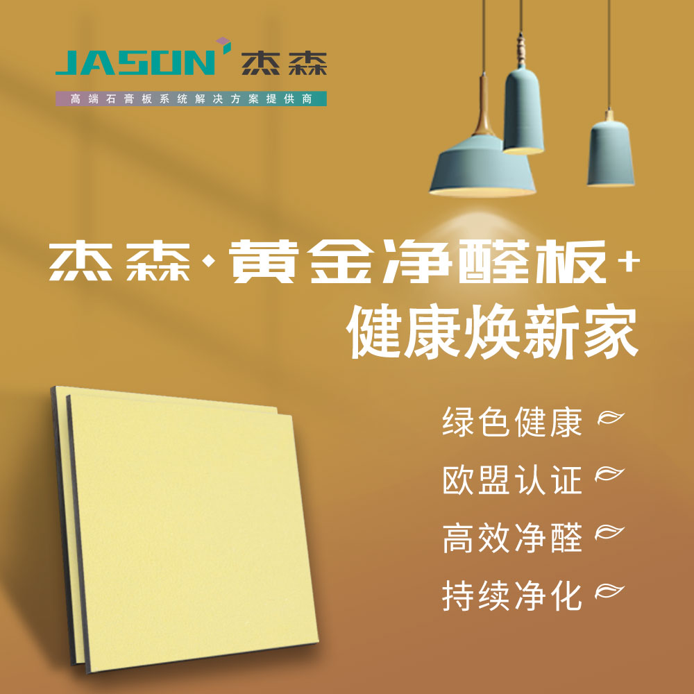 作為室內裝修材料,紙面石膏板的環保等級直接關系著家人的健康和安全。杰森黃金凈醛板+是杰森針對高端家裝市場推出的一款具有甲醛凈化功能的紙面石膏板產品,其以高純度環保脫硫石膏、高強環保黃色護面紙為主原料,產品本身不含磷、甲醛等有害物質成分。